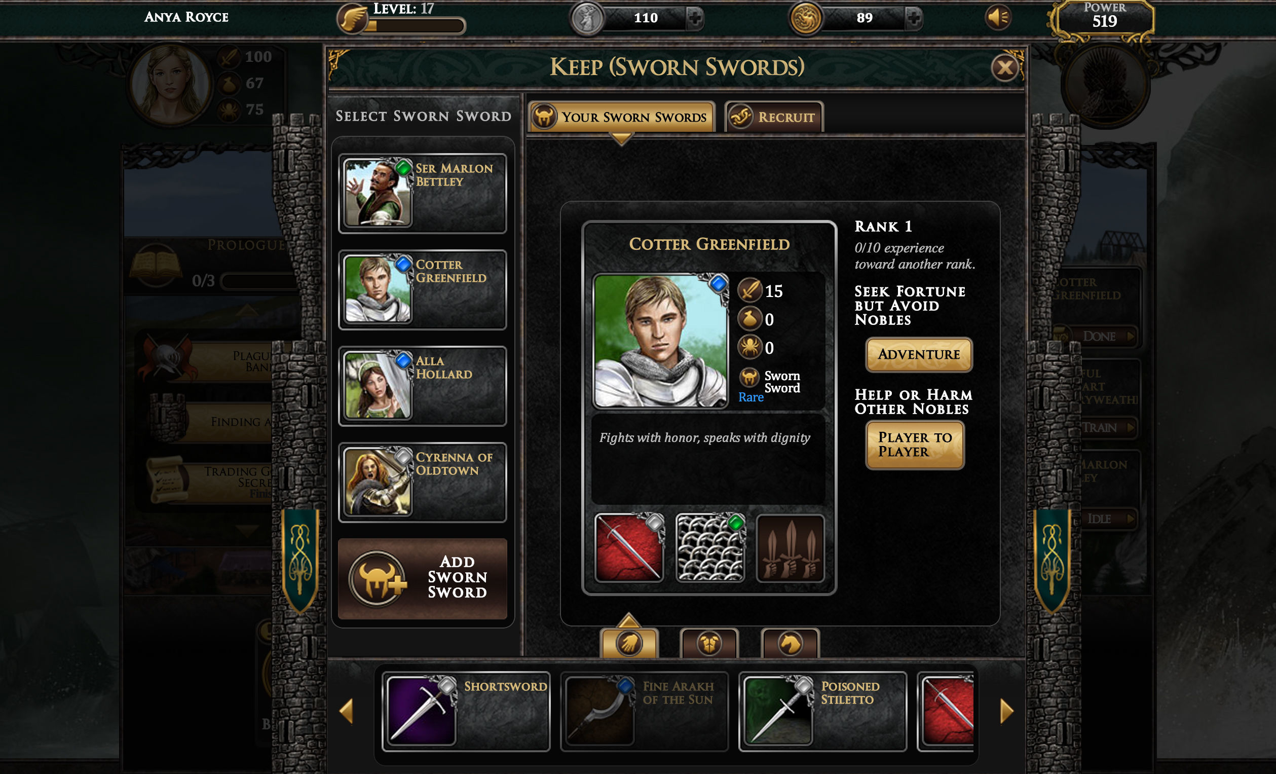 Los inicios son duros, y al comienzo, nuestra casa nobiliaria, no tendrá ni emblema, ni escudo, ni dinero, ni terrenos en los que gobernar. Deberemos empezar desde cero, eligiendo bien nuestras acciones, y construyendo de manera lenta las edificaciones que necesitemos. El juego está en estos compases, esquematizado. Es decir, nos irá recomendando qué construir, qué recompensa recoger cuando subamos de nivel, o qué tipo de aventura elegir. Como os decíamos, en Game of Thrones: Ascent hay varios niveles de juego. Por una parte, lidiaremos con los hechos de ser un noble en Poniente, teniendo en cuenta las interioridades de palacio, los problemas con nuestros herederos o los asuntos que llegan desde la urbe, Desembarco del Rey, vía cuervo. Estos asuntos se reducen -como casi todo en el juego- de forma contextual, eligiendo opciones, respuestas o acciones.