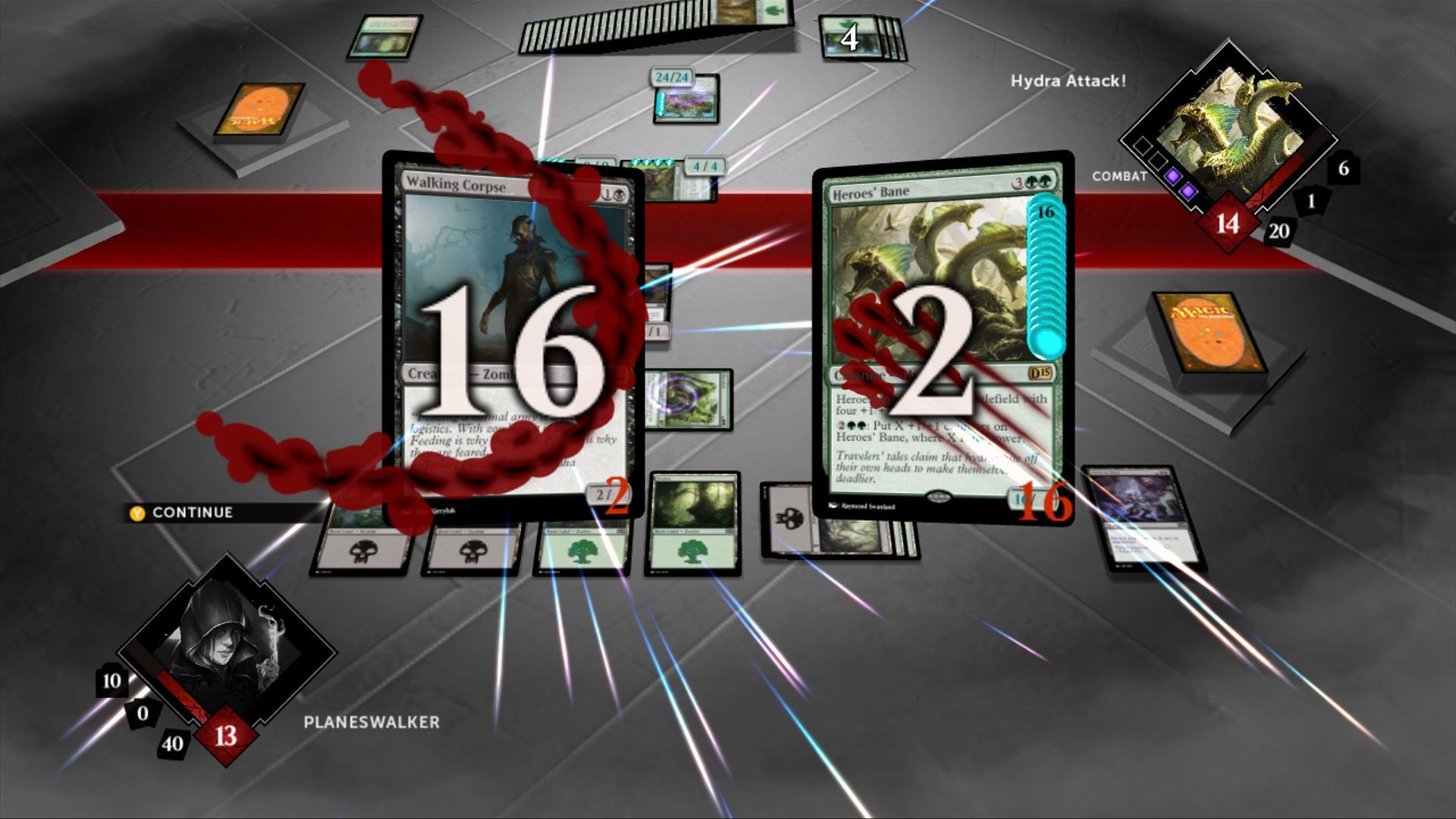 El objetivo principal del juego, es arrebatarle las veinte vidas que tiene cada adversario, haciéndole el máximo daño posible con nuestras maniobras y cartas en cada turno. El Caminante de Planos contrario -así como nosotros mismos- puede bloquear los ataques y achaques con sus propias criaturas y cartas, evitando así que se produzcan heridas al personaje, aunque arriesgándose a que las criaturas se vayan directas a nuestra pila de descartes o cementerio. Las partidas de esta manera, tienen una duración variable, ya que entran en juego muchos factores -entre ellos, la propia suerte o la fuerza de nuestras cartas-. Suena a tópico, pero cada partida es un encuentro único, en el que estaremos solo nosotros, nuestros cartones, las cartas del adversario y la tan nombrada suerte -una mala mano inicial puede ponernos las cosas muy cuesta arriba de primeras-.