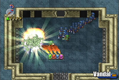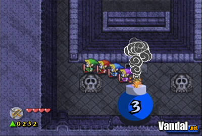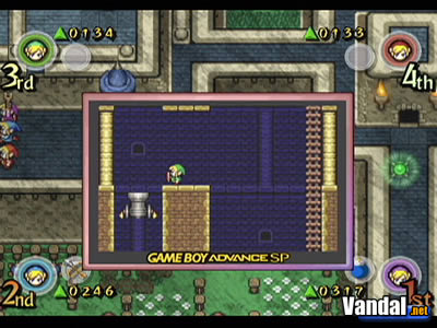 Pero, ¿para qué sirve jugar con una GBA? Básicamente, cuando entramos en una casa, una cueva, o en zonas determinadas, podremos separarnos del grupo (recordemos que, gracias a la espada cuádruple, habrá cuatro Links) y esto es especialmente en el modo multijugador… y, de hecho, obligatorio. Al usar las GBAs, toda la información sobre nuestro Link (medidor de vida, objeto que llevamos y número de gemas) se mostrará en la pantalla de la portátil, permaneciendo oculta a los demás jugadores, pues no sólo deberemos colaborar para superar los puzzles y derrotar a los enemigos, sino que habrá que competir por conseguir la mayor cantidad posible de gemas.