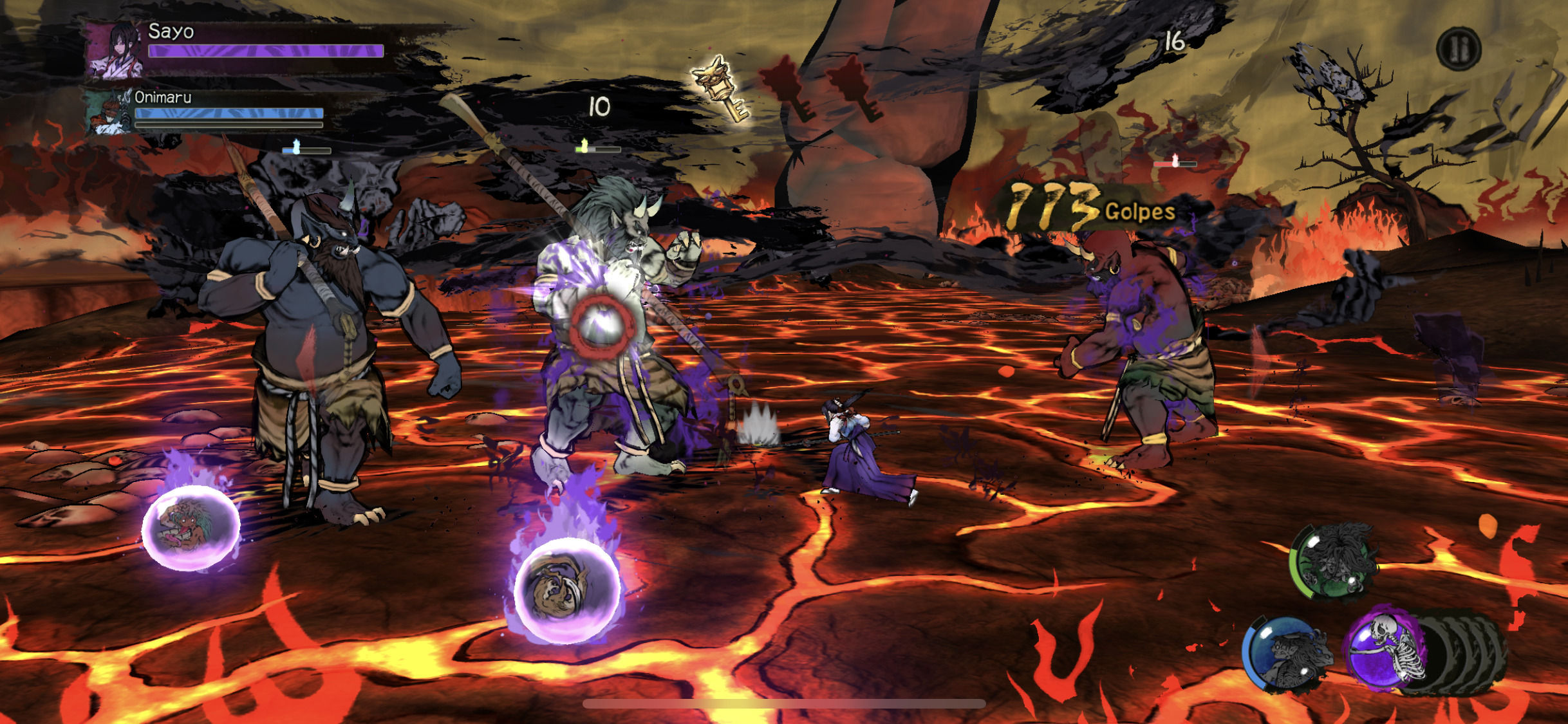 Cada personaje –hay varios a elegir, cada uno con su estilo de combate, que iremos desbloqueando según progresamos–, puede llevar dos yokai permanentes, cuyas habilidades se recargan tras usarlas, así como una selección de yokai de un sólo uso que recogeremos tras derrotarlos o encontrándolos en diferentes zonas del escenario. Aquí también hay un elemento de estrategia, ya que si uno de los yokai recogidos coincide con uno de nuestros principales podemos hacer un ataque doble especial.