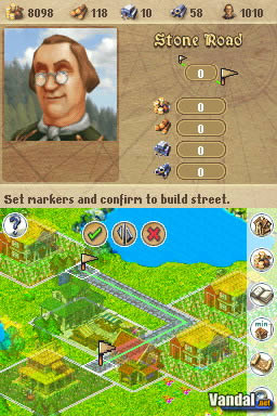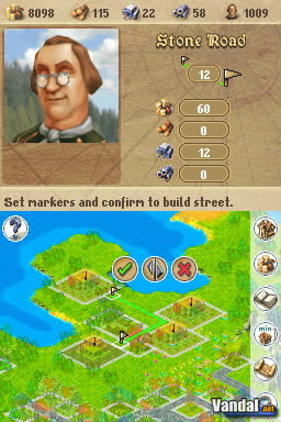 El tema de la resolución, el segundo, ha sido adaptado con menor fortuna aún sin afectar a la jugabilidad. La pantalla superior presenta los indicadores de recursos y a un curioso colono, de enorme parecido con Benjamin Franklin, mientras que la de abajo presenta la visión de nuestra colonia a través de dos niveles de ampliación. Esto último es un problema, ya que cuando la ciudad cobra gran tamaño se hacen necesarios niveles de ampliación mayores, en el sentido de tener al alcance a la visión de todo el poblado.