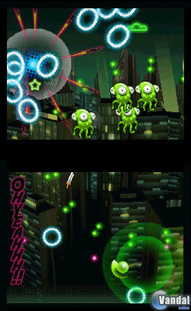 La gracia es que aparte de los fuegos que iremos creando con el lápiz táctil, tendremos a nuestra disposición un pequeño orbe que hará las veces de personaje o nave principal en el juego. Lo desplazaremos pulsando sobre él con el stylus y arrastrándolo hasta la nueva posición, cosa que, por cierto, es incompatible con lanzar cohetes a troche y moche. Así, deberemos de combinar dos movimientos que no podremos realizar simultáneamente: por un lado, deberemos de lanzar los cohetes a nuestros enemigos (que, lamentablemente, no dejarán de pulular por toda la pantalla, pasando, en ocasiones, también por la pantalla inferior de nuestra consola y haciendo, así, peligrar aún más nuestra vida) y, por el otro, deberemos de esquivar tanto el fuego enemigo como los restos de nuestros impactos fallidos moviendo nuestra nave de un lado a otro incesantemente, sobre todo a partir de estadios más avanzados del juego, donde la cantidad de enemigos y de partículas que amenazarán nuestra nave será ingente, lo que nos obligará a movernos sin parar a un lado y a otro de la pantalla (sin olvidar que, además, deberemos de acabar con los enemigos de la pantalla superior).