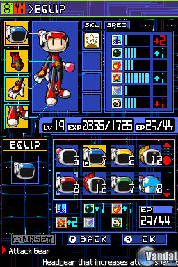 Estos objetos se denominan partes y podrás llevar puestos a la vez cuatro diferentes: una para la cabeza (casco), una para el torso (traje), otra para tu mano (guante) y la última te la podrás poner en los pies (botas). Hay un surtido muy variado de partes para encontrarte en cada fase, y todas y cada una de ellas distintas entre sí y dependiendo de la que hayas encontrado, aumentarán en mayor o menor grado tus poderes (la extensión de las llamas, la velocidad de nuestro personaje…). Pero la capacidad que tiene Bomberman para equipárselas va de la mano con su nivel de experiencia actual que se incrementa a medida que superes las misiones y vayas matando a los enemigos. Entonces, en el caso de que te quieras equipar las más potentes deberás tener un alto nivel.