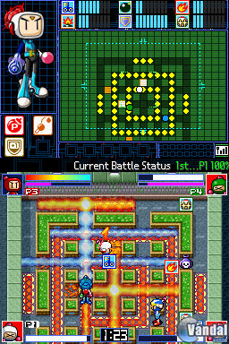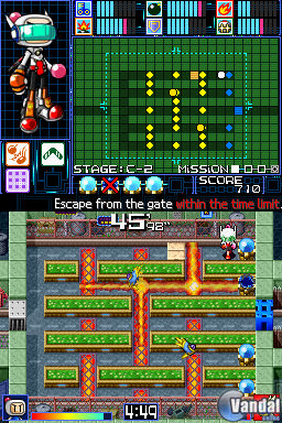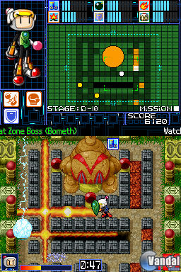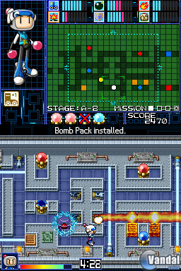 La doble pantalla que da su nombre a Nintendo DS juega un papel importante. Por un lado en la pantalla inferior es donde se desarrolla toda la acción y Bomberman se mueve de un lado a otro poniendo sus bombas, y por el otro lado, la superior siempre nos estará mostrando toda la información referente a los objetivos actuales: los números de enemigos que faltan y dónde están ubicados, resumirá con una pequeña frase la esencia de lo que hay que hacer, tus poderes y habilidades actuales, tu puntuación actual y lo más importante, el mapa de la fase en cuestión.