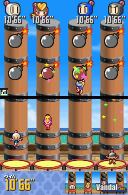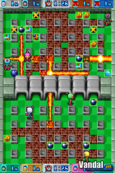 Una vez en el terreno de juego, vemos que se distribuye el mapa entre las dos pantallas en un Bomberman que en nada se diferencia del clásico de toda la vida. La verdad, con tanta experiencia a sus espaldas, Hudson podría haber aprovechado más esta nueva entrega del clásico.