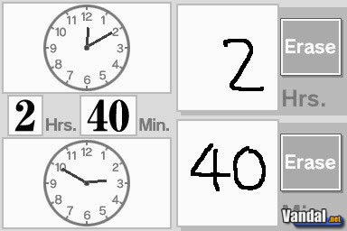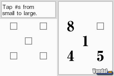 Retentiva: Durante unos segundos veremos una serie de números dispuestos en la pantalla, desordenados. Luego, en la táctil, tendremos unos cuadraditos marcando dónde estaban esos números, y tendremos que pinchar sobre ellos de menor a mayor, es decir, empezando por el número más bajo y acabando por el más alto. El objetivo es hacer cuantos más mejor sin errores, y, al mismo tiempo, recordar la cadena de números más grande.