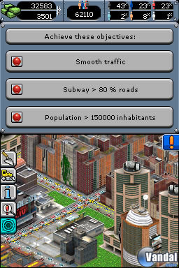 A la izquierda de nuestra pantalla, contaremos con un menú que nos permitirá acceder a las opciones de construcción y demolición de edificios y carreteras, así como a las opciones de información del juego, las cuales nos mostrarán los diferentes avisos referentes a las necesidades de nuestra ciudad o nuestros habitantes (como la necesidad de construir una central eléctrica que nos permita gestionar nuestra propia energía, por ejemplo), así como todas las estadísticas de economía y sociedad referentes a nuestra ciudad.
