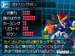 La jugabilidad si está muy lograda. Haremos uso de la pantalla táctil en el garaje, a la hora de personalizar y realizar el mantenimiento a nuestro Custom Robo, así como para girar las cámaras en el escenario que elijamos para mostrar a nuestro robot y donde podremos moverlo a nuestro antojo. Los combates, en cambio, harán uso de la cruceta y los botones: A para saltar, B para utilizar el arma principal y L y R para los cañones secundarios. Sencillo, pero efectivo. El botón X se utiliza para realizar un movimiento de ataque cuerpo a cuerpo con el robot, pero podríamos haber pasado perfectamente sin él. La verdad, en lo que respecta a la lucha en sí, podría haberse mejorado mucho el sistema de combos, porque la verdad es bastante simple y en el mejor de los casos lograremos encadenar sólo tres golpes a la vez.