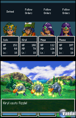 Por otra parte, en las escenas de combate disfrutaremos de la acción en primera persona en la pantalla inferior, donde veremos a los enemigos que nos ataquen (generalmente, reunidos en pequeños grupos) situados enfrente nuestro, pero sin ver a los protagonistas de la historia. En la pantalla superior, en cambio, sí veremos la imagen de nuestros héroes, junto a algunos datos sobre sus atributos, el enemigo al que estemos atacando, y los puntos de salud, fuerza y nivel de experiencia de cada uno.
