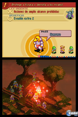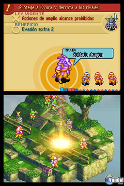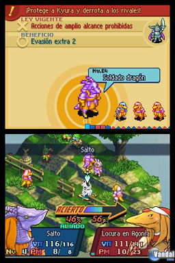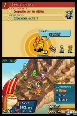 Por otro lado, la pantalla de arriba de nuestra Nintendo DS nos mostrará la información de los personajes que entren en lucha y el orden en los que éstos combatirán en cada turno. Teniendo en cuenta que las bases del rol táctico se fundamentan, generalmente, en el combate por turnos (como es el caso que nos ocupa) habrá que tener muy en cuenta la rapidez de cada personaje a la hora de organizar nuestras estrategias de defensa y ataque, ya que muchas veces aliados y adversarios se irán intercalando en el combate, cambiando incluso el orden de acción en algunos de los turnos.