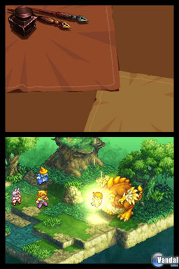 El hecho de que contemos con una pantalla superior y una inferior hace mucho más cómodo el sistema de menús y de opciones de juego. Por un lado, en las pantallas correspondientes a los mapas generales del terreno por el que nos desplazaremos, la pantalla inferior de la consola nos mostrará el mapa concreto del territorio que estemos explorando, con las misiones que hayamos aceptado previamente señaladas en los puntos del escenario donde debamos dirigirnos para realizarlas. Entretanto, la pantalla superior de la consola nos mostrará la información correspondiente a nuestro clan, esto es: el número de miembros del que se compone, las zonas dominadas por el mismo; las misiones que hayamos aceptado o cumplido en ese momento; y los puntos de clan y los guiles (moneda de cambio en el universo de Final Fantasy) de los que disponemos, además de los valores de negociación, destreza, coordinación y adaptabilidad de nuestro equipo.