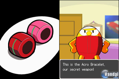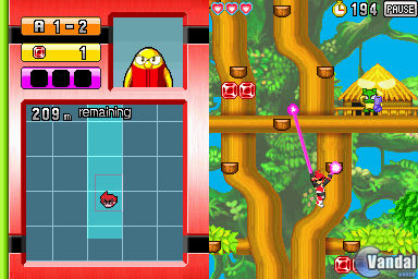 ¿Y cuáles son estas habilidades, que, por otra parte, nos ayudarán a superar cada uno de los niveles del juego, sean del tipo que sean? Pues bien: deberemos de, fundamentalmente, colgarnos de salientes y agarraderas con los látigos que nos otorgarán nuestros brazaletes, de manera similar a como vimos en el magnífico Donkey Kong: Jungle Climber. Nuestros látigos son elásticos, por lo que si nos agarramos de dos salientes, podremos estirarlos hasta cierto punto y, si separamos el lápiz de la pantalla táctil, nuestro héroe saldrá disparado convertido en una bola, con la que podremos eliminar a los enemigos del juego, así como algunos bloques destructibles.