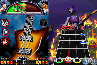 Indispensable, así, para poder jugar al juego, el Guitar Grip se introduce en la ranura destinada para los juegos de GameBoy Advance que hay en la parte inferior de nuestra consola, y se adapta bastante bien a nuestra mano, pudiendo sujetarla mediante la correa dispuesta en el mismo a tal efecto. La consola la colocaremos verticalmente, como si fuera un libro, y la cogeremos con la mano izquierda. También podremos voltearla convenientemente en caso de que seamos zurdos. El sistema, de hecho, ha implementado un sistema de control para zurdos excelente, pudiendo no sólo voltear las imágenes en las dos pantallas de la consola, sino cambiar el orden de los botones en el juego (esto es, para que coincidan con la configuración para diestros), para darnos más opciones y que, de esta manera, el control nos resulte más sencillo. Además, contaremos con un adaptador para introducir el periférico en la Nintendo DS antigua, cosa que, realmente, constituye todo un acierto.