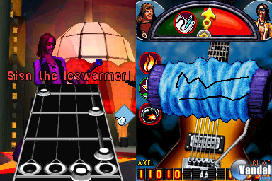 Por otra parte, el lápiz táctil lo sustituiremos por una púa, que utilizaremos para "rasgar" las cuerdas de nuestra guitarra en la pantalla táctil de nuestra consola. El Guitar Grip viene con una ranurita dispuesta para que podamos colocar en su interior la púa de marras, de tal manera que el transporte de la consola con todos los accesorios necesarios para jugar al juego sea lo más cómodo posible. Eso sí, el sistema no carece de defectos: la verdad es que el dichoso accesorio no acaba de ser todo lo cómodo que debiera, y al cabo de pocos minutos, notaremos la mano que sostiene la consola bastante agarrotada. De hecho, el mismo juego nos indica que debemos descansar aproximadamente cada quince minutos de juego, para evitar así lesiones en nuestra mano.