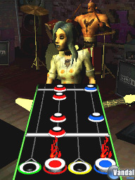 Por otra parte, el lápiz táctil lo sustituiremos por una púa, que utilizaremos para "rasgar" las cuerdas de nuestra guitarra en la pantalla táctil de nuestra consola. El Guitar Grip viene con una ranurita dispuesta para que podamos colocar en su interior la púa de marras, de tal manera que el transporte de la consola con todos los accesorios necesarios para jugar al juego sea lo más cómodo posible. Eso sí, el sistema no carece de defectos: la verdad es que el dichoso accesorio no acaba de ser todo lo cómodo que debiera, y al cabo de pocos minutos, notaremos la mano que sostiene la consola bastante agarrotada. De hecho, el mismo juego nos indica que debemos descansar aproximadamente cada quince minutos de juego, para evitar así lesiones en nuestra mano (sic).