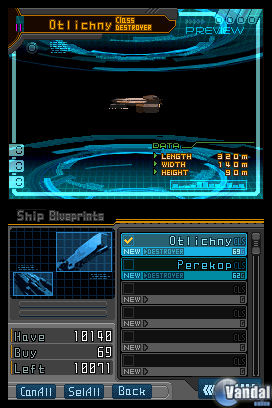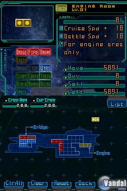 Pero bueno, siempre podemos experimentar con diferentes disposiciones en el equipamiento y armamento de nuestras naves, o incluso en la asignación de cargos dentro de nuestra tripulación. Las diferencias en cada caso pueden llegar a ser muy notorias y determinantes a la hora de llevar un combate a buen puerto. Además, si queremos realmente ver cómo funciona nuestra nave o nuestra flota en combate, siempre podemos invitar a un amigo que tenga el juego a que realice junto a nosotros un simulacro de combate, a través de la conexión local de nuestras Nintendo DS.