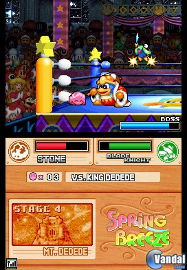 Así, en Spring Breeze y en Dynablade, por ejemplo, deberemos de enfrentarnos a aventuras muy similares a las de la clásica saga Kirby’s Dreamland, en una serie de escenarios divididos en diferentes niveles que nos conducirán a través de diversos obstáculos y enfrentamientos a la lucha final contra un jefe de mayor tamaño y dificultad. El control del juego, todo hay que decirlo, es el tradicional de todas las aventuras de Kirby, y nos permitirá engullir a nuestros enemigos y reproducir sus poderes, así como volar por los aires hinchando nuestro orondo cuerpo.