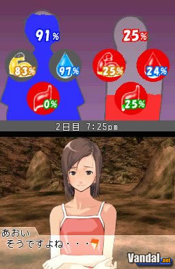 Otra de las apuestas originales de Lost in Blue es la gestión de dos personajes en la aventura. Empezaremos la partida manejando a Keith en solitario, pero enseguida encontraremos a la segunda protagonista, Skye. No tomaremos el control sobre ella directamente (al menos no en la primera partida), pero, siguiendo el esquema chico-tiene-que-cuidar-de-chica que parece haberse puesto de moda a partir del Ico de PS2, deberemos estar muy pendientes de controlar sus niveles de energía y proporcionarle comida, agua u obligarla a dormir cuando sus constantes sean bajas.