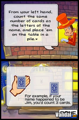 Y, por último, contamos con una sección compuesta por diversos minijuegos, supuestamente implementados dentro del título para que desarrollemos nuestras habilidades como mago, esto es, la rapidez y precisión con el stylus, el tiempo o pulsación interna, nuestra capacidad perceptiva, y la habilidad con la baraja de cartas. Entre los juegos que componen esta sección, encontramos los sempiternos solitarios, imprescindibles en cualquier título en el que aparezca una baraja de cartas; otros minijuegos en los que deberemos de seguir la pulsación durante diez segundos para poner a prueba nuestro reloj interno; y una serie de pruebas en las que deberemos de copiar en la pantalla inferior una serie de caracteres escritos boca abajo en la pantalla de arriba. La verdad es que la selección no es muy variada, y algunos de los juegos son poco agradecidos, además de poco divertidos, pero los solitarios nunca están de más, y pueden hacernos pasar unos cuantos buenos ratos en compañía de nuestra consola.