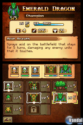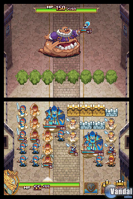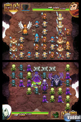 Pero lo más curioso es cómo deberemos de preparar a nuestras unidades para el ataque. Las unidades nos irán saliendo de manera aleatoria en la pantalla inferior, pantalla que utilizaremos para desarrollar nuestra estrategia, mientras en la superior vemos la plantilla del ejército enemigo. Dispondremos de diferentes columnas sobre las que irán cayendo nuestras tropas y, como si de un juego de puzle se tratase, deberemos de agruparlas por tipo de unidad y por colores. De esta manera, si juntamos tres unidades en vertical, comenzarán a cargar su potencial de ataque el número de turnos indicado para cada tipo de unidad. En caso de que las unidades se unan horizontalmente, lo que conseguiremos es una barrera que bloqueará los ataques enemigos, aunque no impedirá que nuestras unidades desplieguen tranquilamente sus propios ataques.