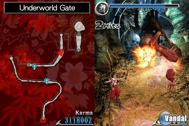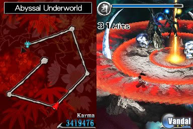 Como ya mencionábamos al inicio del análisis, Ninja Gaiden Dragon Sword saca partido de las características más definitorias del sistema portátil de Nintendo, esto es, la doble pantalla, las funciones táctiles de la pantalla inferior y el micrófono. Para empezar, deberemos de coger la consola de manera que quede orientada verticalmente, como ya hubimos de hacer en otros títulos de la consola como Hotel Dusk: Room 215 o los sempiternos Brain Training. Durante el juego, la pantalla que quedará a nuestra izquierda nos mostrará los mapas de los escenarios en los que nos encontremos en cada momento, mientras que la pantalla táctil nos presentará la acción del juego propiamente dicha. Manejaremos todos los movimientos de nuestro personaje a través de diferentes pulsaciones y trazos con el lápiz táctil, tanto para desplazarnos por los diferentes entornos como para atacar a nuestros enemigos. Por otra parte, pulsando cualquiera de los botones de nuestra consola realizaremos un movimiento de bloqueo que nos servirá para reducir el daño de los impactos del enemigo. De esta manera, la postura aparentemente más idónea para coger la consola es desde abajo, pulsando con el dedo pulgar la cruceta para bloquear, o sosteniendo la consola con toda la palma de la mano, utilizando los gatillos laterales para los movimientos defensivos.