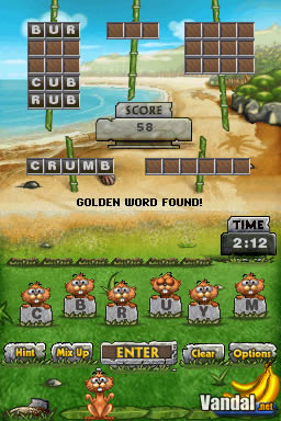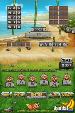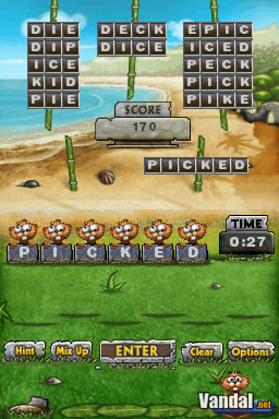 Word Whomp es un juego en el que deberemos crear con seis letras un determinado número de palabras de tres, cuatro cinco o seis letras, en un tiempo determinado. A medida que vamos descubriendo palabras, en la parte inferior de la pantalla táctil una ardilla devorará una serie de frutas que nos otorgarán un bonus en la puntuación. Además, hay una palabra clave que nos dará mayor puntuación que el resto. El problema es que Electronic Arts no parece haber pensado en el público europeo a la hora de desarrollar Pogo Island, y todo el vocabulario de Word Whomp está formado por palabras en inglés, con lo que es fácil quedarse atascado con determinadas combinaciones de letras.