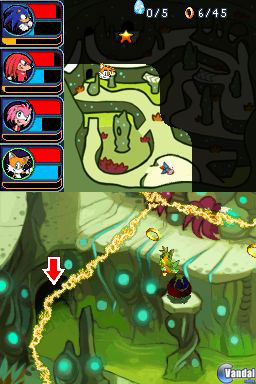 Por los escenarios nos movemos empleando completamente la pantalla táctil, aunque en pantalla, mientras exploramos los entornos, sólo habrá un personaje en pantalla aunque en nuestro equipo haya varios. Será importante en determinadas ocasiones cambiar de personaje para aprovechar sus habilidades especiales para poder llegar a zonas de otro modo inaccesibles, todas ellas, claro, sacadas en su mayor parte de los plataformas de la saga de manera que, sin ir más lejos, Knuckles puede escalar, Tails puede volar con sus colas, etc. Combinando las diferentes habilidades (y no es necesariamente una por personaje) podremos solventar puzles, encontrar ítems escondidos y, sobre todo, avanzar hacia el desenlace del juego. Entre esos objetos desperdigados estarán los huevos de Chaos, con unos cuarenta repartidos por todo el juego para criar en el Jardín más tarde.