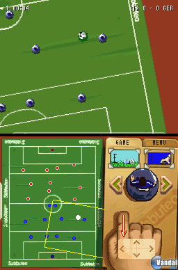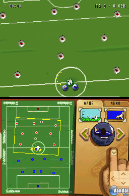 Primero de todo, deberemos de colocar los peones en el campo al comenzar el partido. La posición en la que pongamos a éstos determinará, de esta manera, la estrategia inicial de partido, la cual, sin duda, marcará los acontecimientos del mismo desde el principio. Para seleccionar un peón en el campo, sólo deberemos de pulsar sobre el punto que lo representa con el lápiz táctil. Como los puntos de marras son minúsculos, y en ocasiones será difícil que acertemos a la primera en el peón deseado, tendremos también la opción de seleccionarlo mediante los botones X o Y.