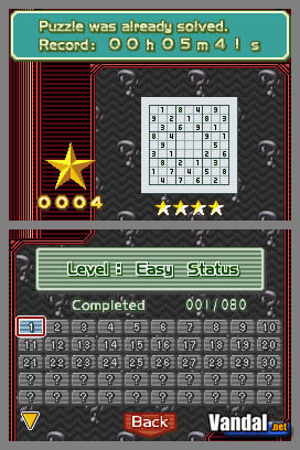El juego tiene cuatro niveles de dificultad: el nivel de práctica (con diez sudokus), y los niveles fácil, normal y difícil (con cincuenta sudokus cada uno), de manera que el título se compone de 160 puzles, una cifra más que respetable. Sin embargo, no todos los sudokus estarán disponibles desde el principio, y para poder acceder a ellos tendremos que acumular estrellas, que se nos dan al acabar cada sudoku en función de cómo ha sido de brillante nuestra actuación. Se trata de un interesante incentivo para rejugar los rompecabezas ya superados, aunque en ocasiones puede resultar a ser un tanto tedioso.