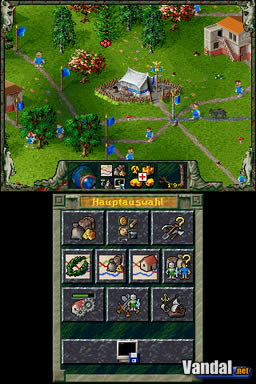 En cuanto al sistema de control, como decíamos toda la acción se controlará perfectamente con la pantalla táctil en la que deberemos ir seleccionando las opciones que deseamos ejecutar de forma sencilla. De este modo, como explicábamos con anterioridad, si queremos crear caminos simplemente lo haremos marcando la casilla correspondiente en el menú y luego enlazando banderas (aunque en este caso, dado el tamaño de la pantalla, el sistema puede resultar algo impreciso), o lo mismo a la hora de construir alguna de las edificaciones que las escogeremos de entre una larga lista. Aparte de este tipo de acciones, nos encontremos también con la posibilidad de intercambiar el contenido de las dos pantallas con el botón L1 para trastear en otro tipo de menús más complejos que por norma se nos mostrarán en la pantalla superior de Nintendo DS.
