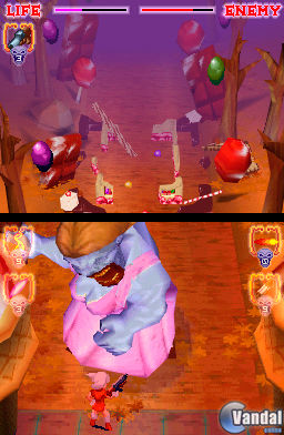 Y, claro, contaremos con algunas armas que nos harán momentáneamente la vida mucho más fácil. Tendremos la posibilidad de recoger una escopeta, un lanzallamas y un láser por el camino, de munición limitada, y que podremos seleccionar presionando sobre sus correspondientes iconos a los lados de la pantalla inferior de nuestra consola. Tendremos un arma de munición ilimitada (un fusil que disparará shurikens, en el caso de Momotaro, y una tradicional ametralladora, en el caso de la "tierna" Caperucita), que dispararemos presionando sobre la pantalla táctil en la dirección que deseemos. Recargaremos el arma levantando nuestro stylus de la pantalla, cosa que deberemos de hacer a menudo, ya que cuando agotemos un cargador nuestra arma dejará de disparar.