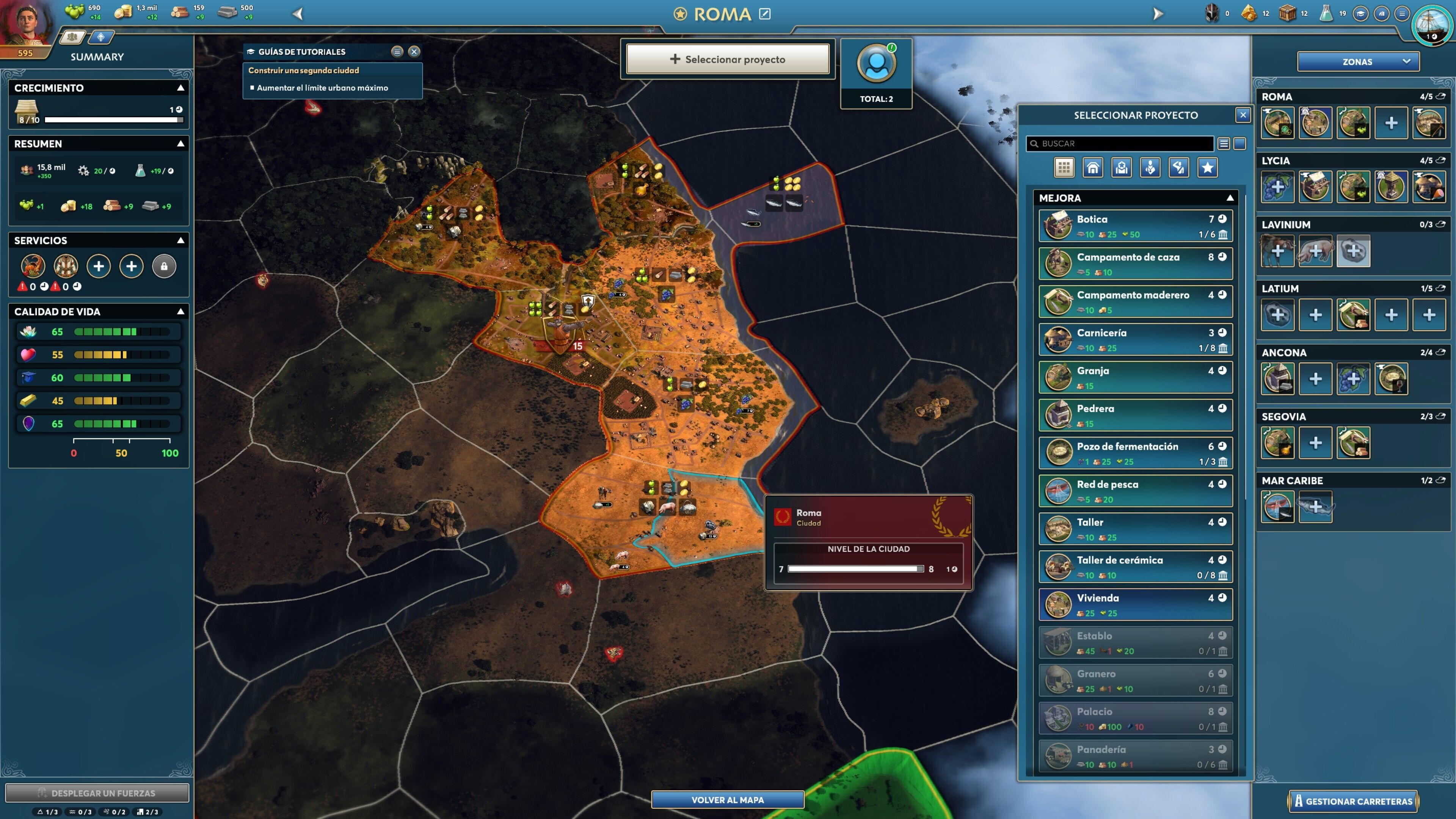 Además, cuando expandimos nuestra ciudad (o fundamos una) para ocupar una nueva región, esta vendrá acompañada de lo que podríamos definir como "comarcas", lugares dentro de una misma región que podrán tener recursos especiales como hierro, oro, trigo o animales y en las que podremos construir mejoras para la ciudad.
