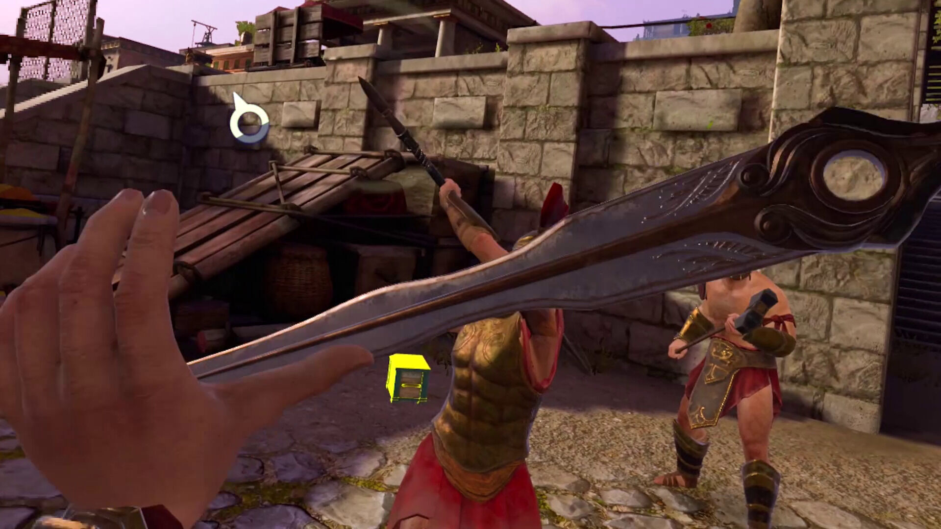 Pasando al apartado audiovisual, Assassin’s Creed Nexus hace bien varias cosas de las que solemos quejarnos en los juegos de realidad virtual. Está correctamente doblado al español, con buenas voces para los personajes principales y secundarios, y con diálogos que no paran de repetirse en los transeúntes de las ciudades y en los enemigos. Además, aunque es un título con mucha carga narrativa, nunca te arrebata el control demasiado tiempo mientras otro personaje te da su discurso; está bien medido en este sentido. Por eso nos sorprende que caiga en otros errores que rompen la inmersión, como los fundidos a negro en ciertas secuencias, que en conjunción con otros elementos, nos llevan a apuntar a que están ahí por limitaciones técnicas de los dispositivos Quest.