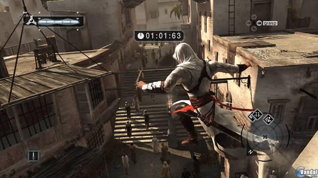 Aquellos que quieran pasar rápidamente la trama de Altair lo tendrán difícil, ya que el juego cuenta tanto con una notable dificultad como un número largo de misiones, tanto de la trama principal como secundarias. De hecho, la curva de dificultad puede ser un tanto alta para el jugador primerizo, aunque luego las misiones siguen una curva bien enlazada. En fin, como en cualquier juego de infiltración, el combate directo es la peor opción y el desarrollo se basa en esconderse, planificar el ataque y salir corriendo una vez realizado. Todo ello sin que nos vean ni los enemigos, ni los guardias ni algún espectador curioso que nos quiera incriminar. En el caso de ser descubierto o planificar una huida, tendremos que acudir a los edificios, a los tejados, para guarecernos y realizar la clásica huida propia de las películas de aventuras. Todo el sistema de saltos está magníficamente implementado, y en ningún caso parece una sección impostada; es quizá uno de los mayores y poco reconocidos éxitos de Assassin’s Creed.