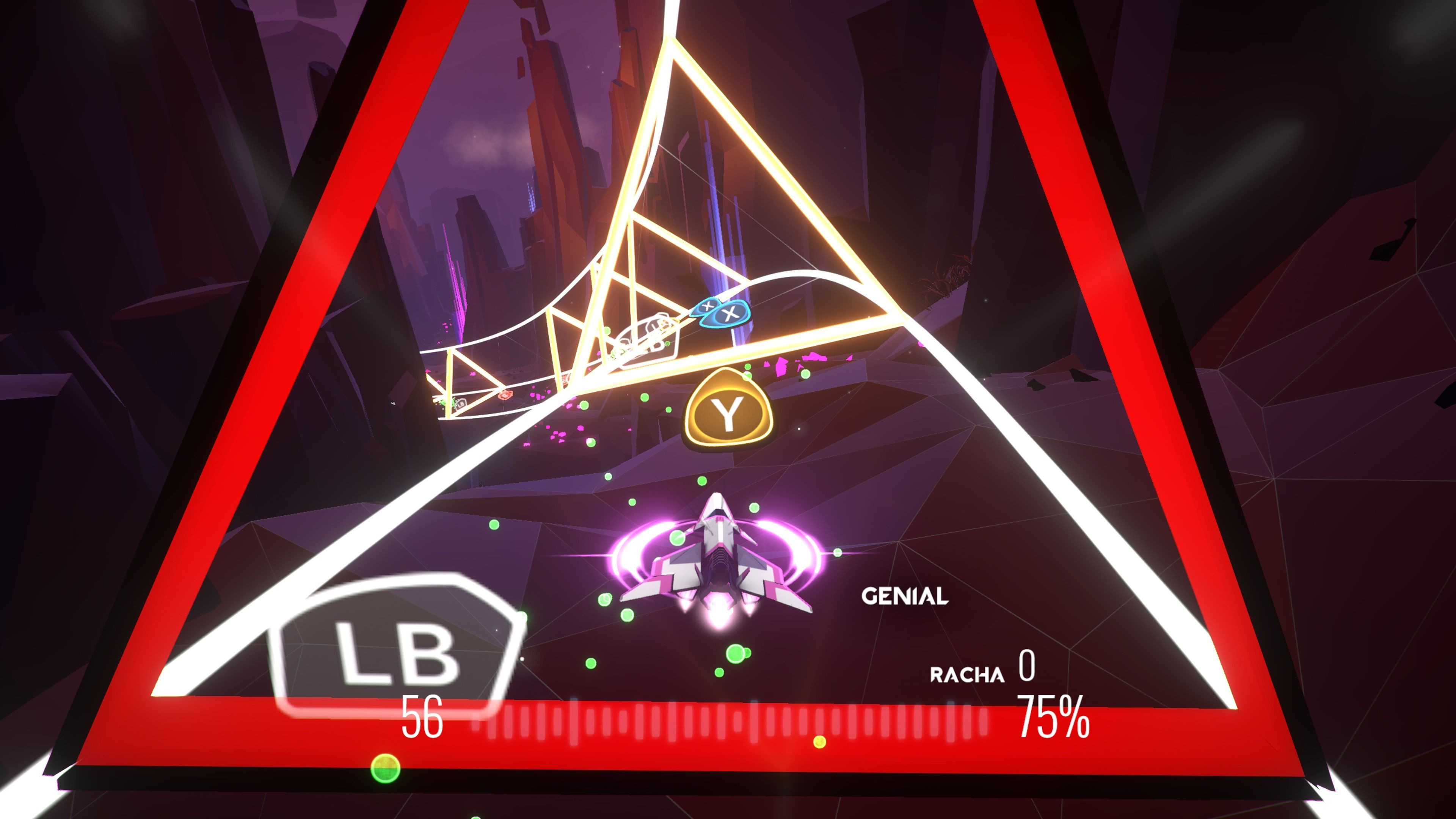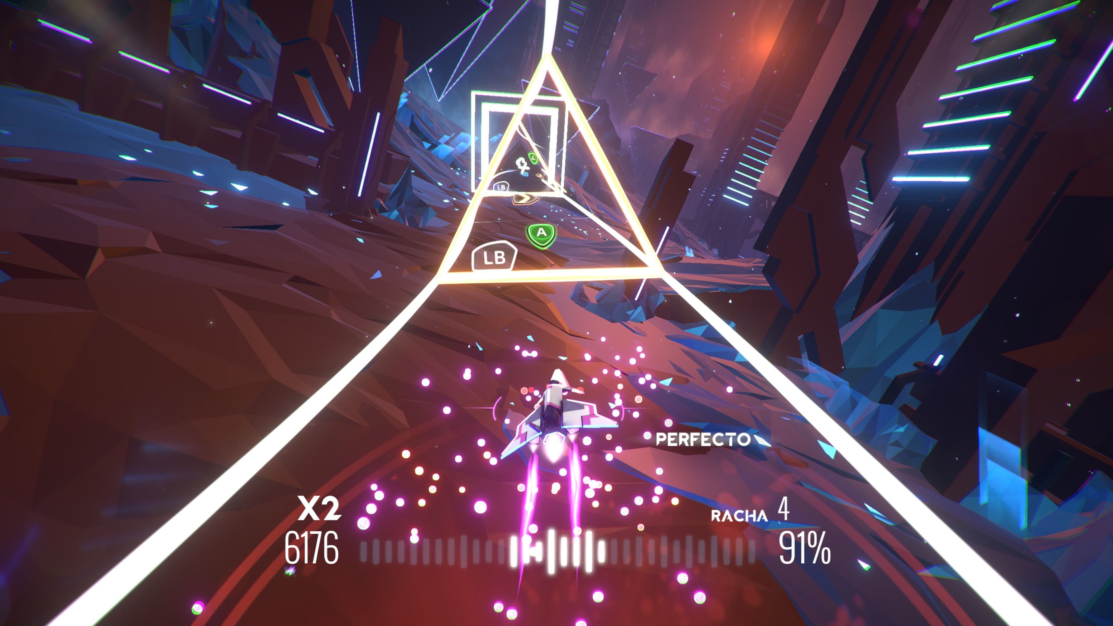 Avicii Invector es un título musical que toma prestada ciertas características de Frequency y Amplitude, la saga de Harmonix. En esencia, tenemos tres carriles con notas en cada uno, y tendremos que movernos entre ellos para poder tocarlas todas, mantener el combo y alcanzar las puntuaciones más altas. La diferencia con los títulos mencionados es que cada carril no representa un instrumento, y sólo hay una línea de notas repartidas por los tres carriles. Además, generalmente, estos tres carriles se unen formando un triángulo, que recorremos por dentro, aunque en lugar de desplazar nuestra nave entre los carriles, son los carriles los que se mueven. Puede sonar complejo, pero no lo es en absoluto.