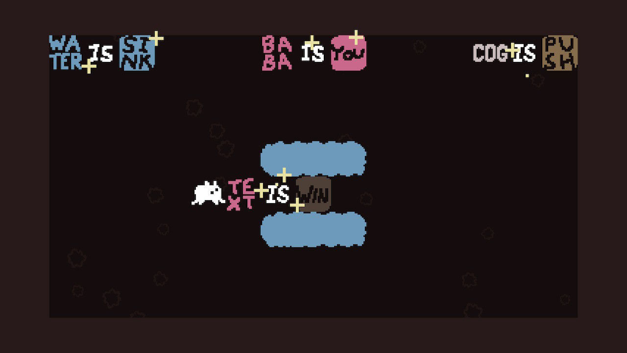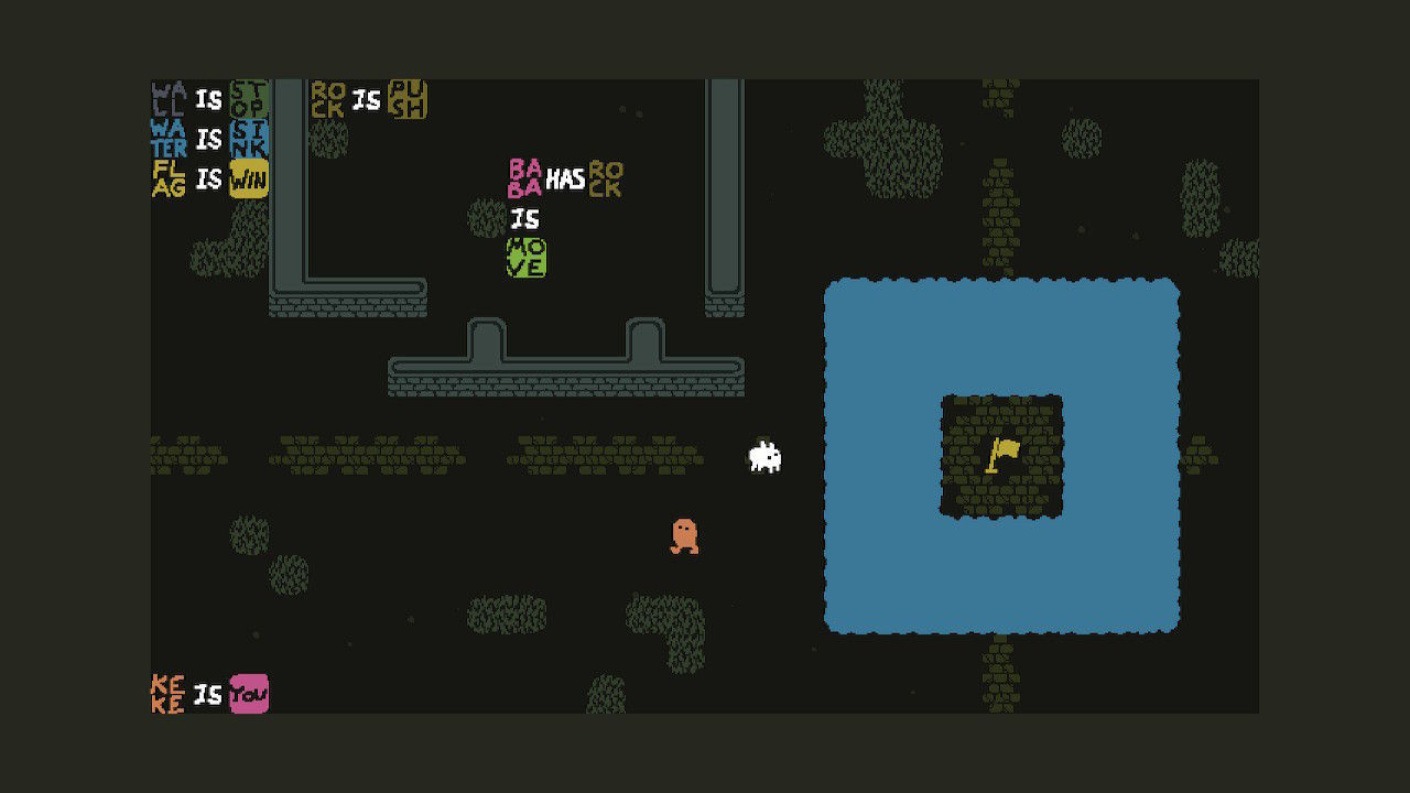 Baba is You es un juego de puzles en el que la principal mecánica gira en torno a la lógica, una lógica similar a la que podemos encontrar en la programación. Los niveles cuentan con textos con diferentes categorías. Por ejemplo, objetos (Baba, bandera, agua, roca…), acciones (ganar, hundir, bloquear, abrir…), los conectores (es, y…) y lo más importante, el control de nuestro personaje, que se representa con «tú».