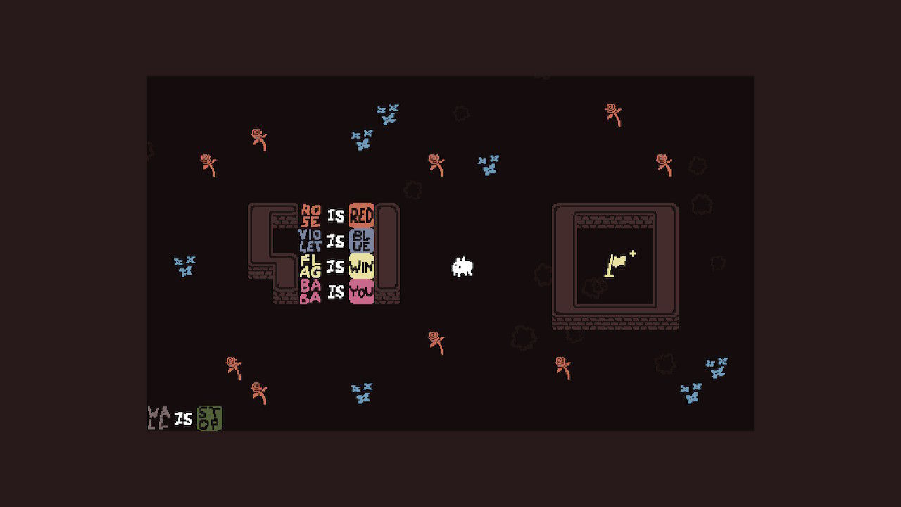 Como podéis ver en estas imágenes, Baba is You es un juego extremadamente sencillo en lo visual, con una estética totalmente retro, pero que, creemos, está hecha con mucho cariño. Todos los elementos en pantalla se mueven ligeramente, y le da cierto encanto a la escena. Al fin y al cabo, es una apuesta por lo más funcional. Las palabras y sus funciones están clarísimas, los objetos son perfectamente reconocibles, y con un vistazo rápido podemos entender cuál es el problema y empezar a plantearnos cómo solucionarlo.