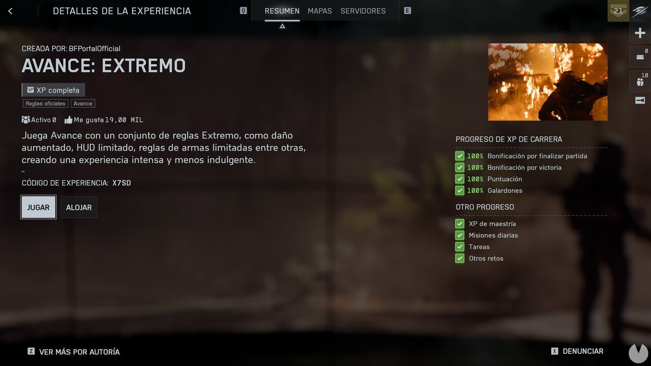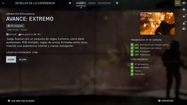 Por parte del jugador más tradicional seguramente lo más interesante aquí es el disfrutar de las distintas experiencias de juego. En estos primeros días hemos encontrado con facilidad en la sección comunidad del juego desde modos 'hardcore' con reglas especiales hasta carreras de aviones o vehículos, pasando por una especie de modo Horda y a buen seguro Portal será capital a medida que pase el tiempo, los jugadores completen las progresiones de su clase favorita y se aprendan mejor los mapas con los que llega el juego. Además, hay filtros para ordenar estas experiencias por votaciones, popularidad o distintas temáticas.
