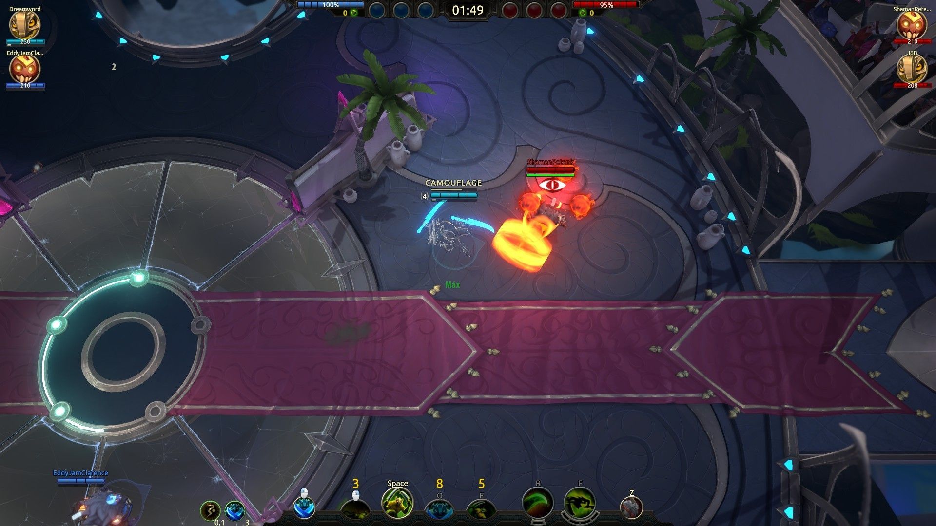 La diferencia es sustancial, ya que en Battlerite no tendremos ni minions, ni torretas, ni base enemiga que destruir en su modo principal (aunque han añadido un nuevo modo con algunas de estas características del que os hablaremos más adelante), sino que todo se decidirá en una cruenta batalla entre nuestro equipo y el contrario, utilizando toda nuestra habilidad, puntería y poderes especiales disponibles.