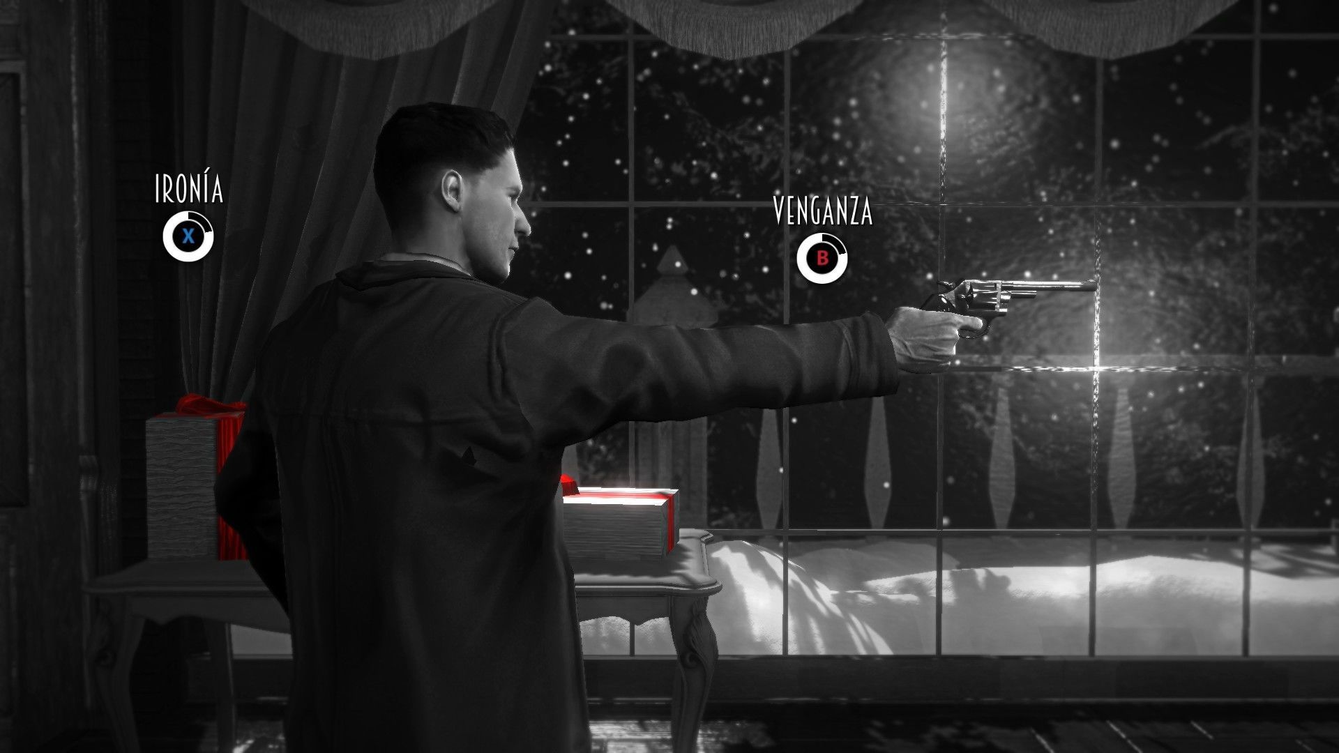 Lo primero que llama la atención es su dirección artística, muy buena, y bastante valiente, ofreciendo unas imágenes en blanco y negro con mucha fuerza, al estilo del cine negro, en el que solo hay una excepción, los elementos de color rojo, que sí se nos muestran, ofreciendo un atractivo contraste. Los semáforos en rojo, las alfombras, las bocas de riego, algunos vestidos y corbatas, y por supuesto, la sangre, ya que esta aventura no escatima en violencia, es un juego bastante crudo, aunque siempre deja hueco para unas dosis de humor, sin duda una seña de identidad de su guionista, Josué Monchan, conocido por su trabajo en Pendulo Studios.