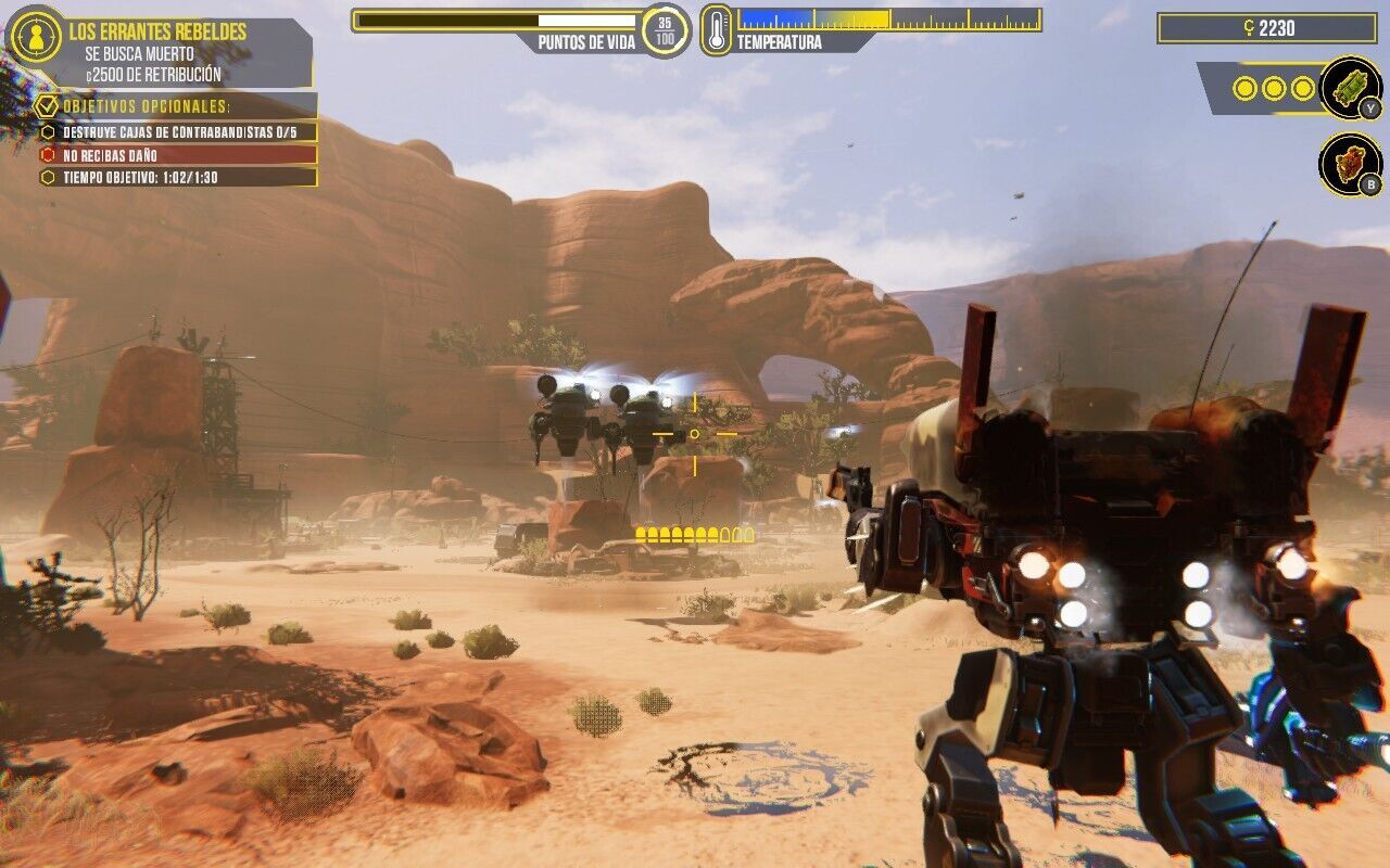 Como decimos, la estructura del juego se divide entre dos pilares: el combate en mecha y la gestión de la base. En combate, Bounty Star es poco más que correcto. El control del mecha es, en nuestra opinión, bastante torpe y poco satisfactorio. Cada enfrentamiento combina disparos a distancia con ataques cuerpo a cuerpo, impulsos para esquiva y una gestión táctica del calor y la energía, una mecánica interesante que hace que, por ejemplo, cuando hace más calor nuestro robot se sobrecaliente más rápido y tengamos que ser más comedidos con nuestros ataques.