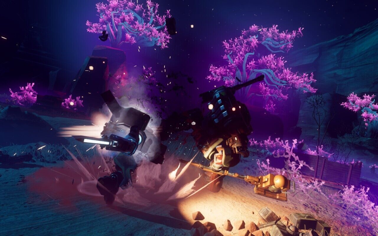 El apartado artístico es, sin duda, uno de los grandes aciertos del juego. El desierto de Bounty Star no busca ser realista, sino evocador. Los tonos anaranjados que, de nuevo, contrastan con los colores fríos de la noche, y el diseño retrofuturista de los mechas crean una identidad visual muy marcada. Las animaciones de los personajes humanos son un poco pobres, en nuestra opinión, pero tampoco son una parte fundamental de la experiencia. Donde el juego tropieza sin duda es en su rendimiento. Aunque las batallas son intensas, los problemas de rendimiento son frecuentes, al menos en Steam Deck. Vale que en PC funciona mejor por razones obvias, pero no creemos que técnicamente sea un juego tan exigente como para que le cueste mantener las 60 imágenes por segundo en la portátil de Valve incluso en momentos en los que no pasa nada en pantalla así que si vais a jugar en un hardware poco potente, tenedlo en cuenta.
