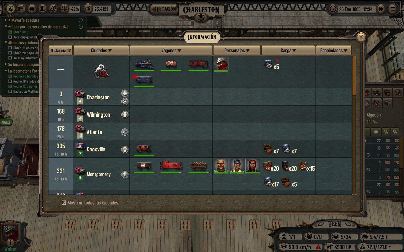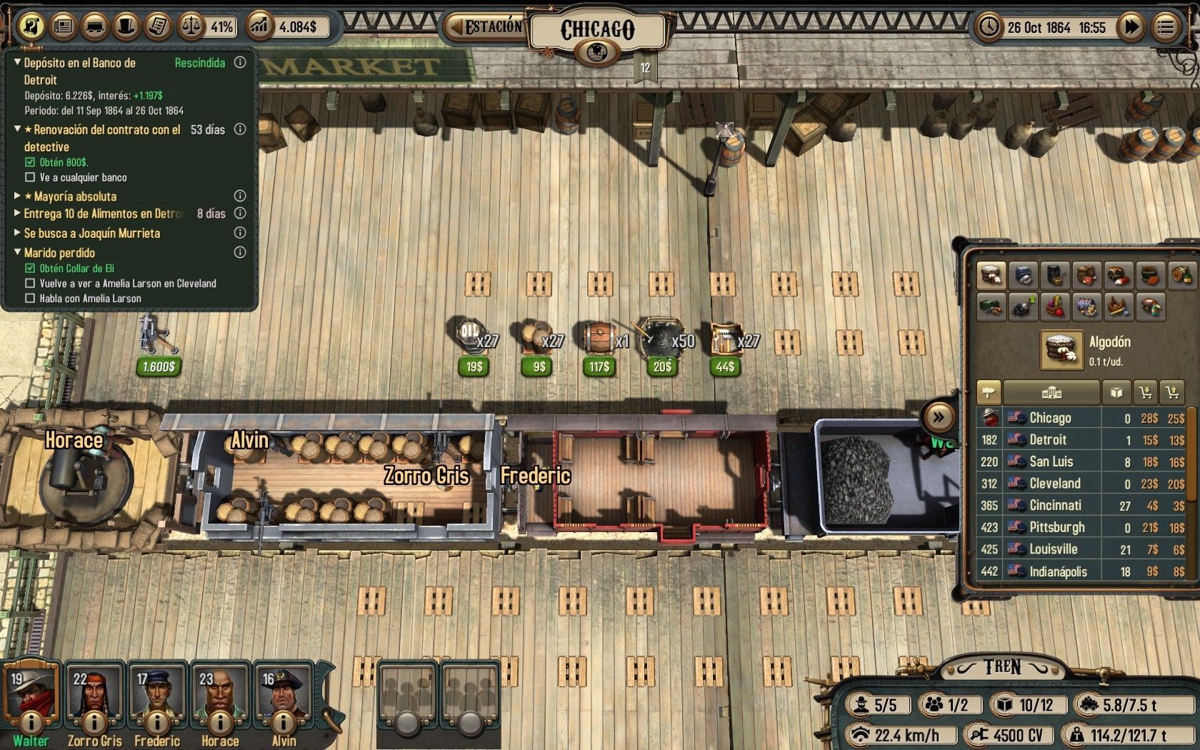 Reed se sube a su tren y va comerciando entre las distintas ciudades que tiene que recorrer analizando los mercados. Esta parte de gestión comercial que funciona muy bien y casi siempre te da una alternativa o una opción para conseguir ingresos. Si no directamente con la compra-venta de bienes, con misiones de transporte que te dan en las ciudades; analizando bien los recorridos y los mercados casi nunca terminarás en números negativos tras un trayecto.