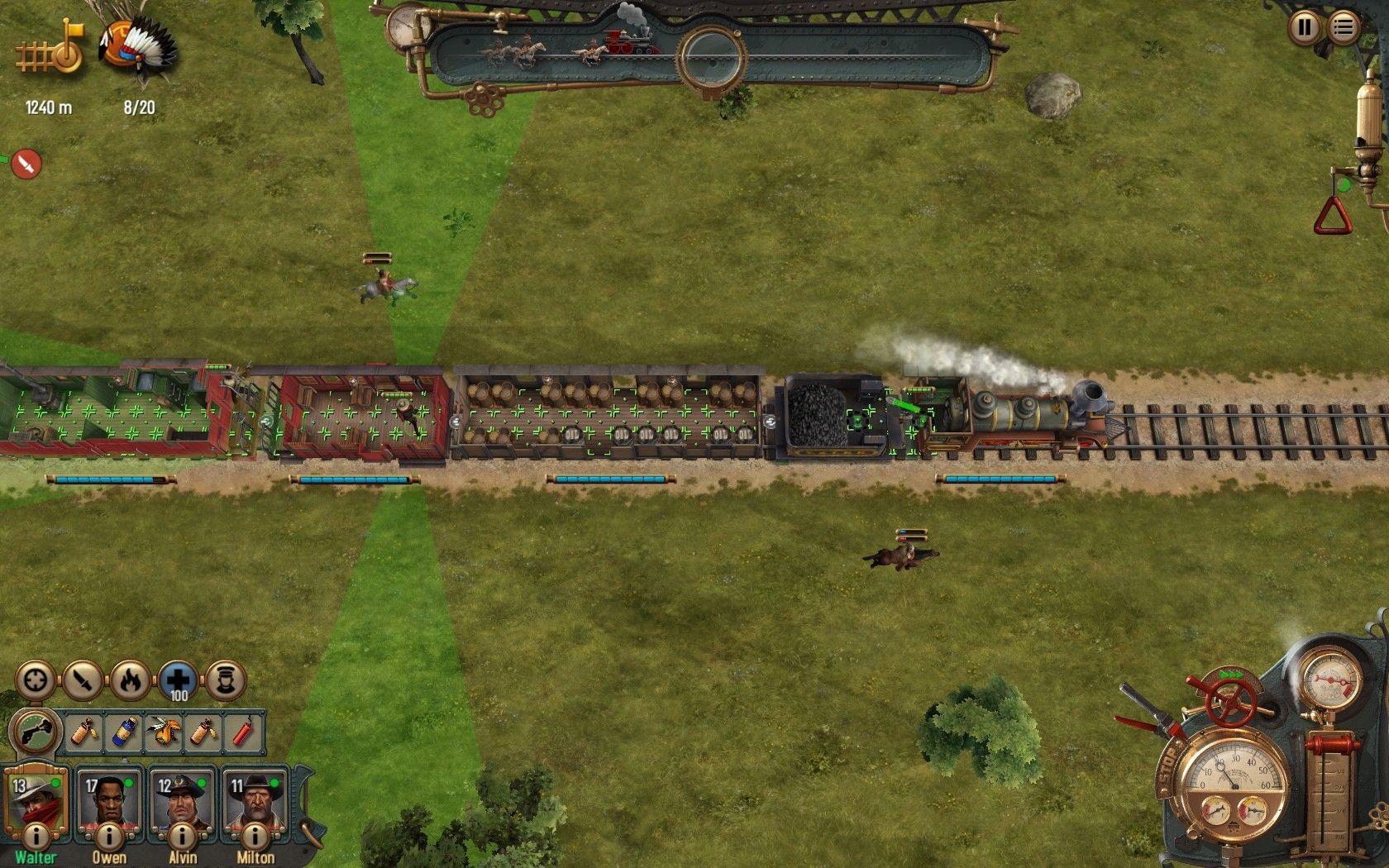 Uno de estos vagones es el furgón, necesario si quieres llevar un equipo de hasta cuatro hombres que te ayuden en los tiroteos ya sea disparando a los enemigos o arreglando los desperfectos que se vayan produciendo en el tren. Los vas contratando en las distintas estaciones y campamentos y van subiendo de nivel -lo mismo que Walter Reed- con la experiencia que van adquiriendo y en cada subida de nivel vas personalizando más sus habilidades.