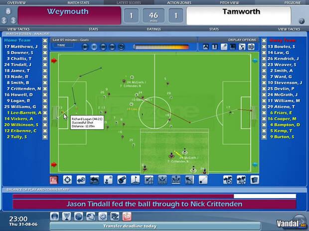 Enlazando con el partido, una vez acabado éste nos encontraremos con un análisis concienzudo a través de Pro Zone. Esta herramienta es totalmente superior a lo visto en el género, y bien merece la promoción que Eidos la ha dado. Estamos hablando de estadísticas en el estilo profesional: posesiones en un área por cada jugador, número de pases de cada jugador y la posibilidad de ver el partido entero viendo un evento específico que creamos fallido y mejorable. La herramienta mide hasta los cruces de los jugadores de una zona a otra, todo un delirio de complejidad. Todas estas indicaciones nos pueden servir para realizar cambios tácticos, y ver en qué falla nuestra gestión como entrenadores.