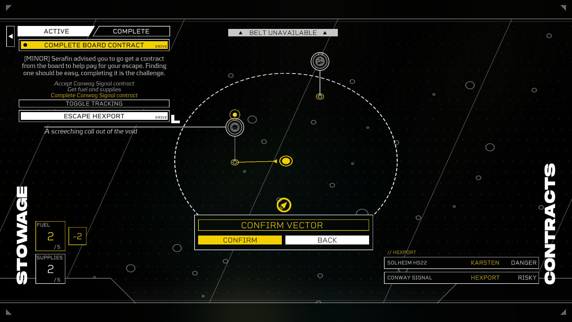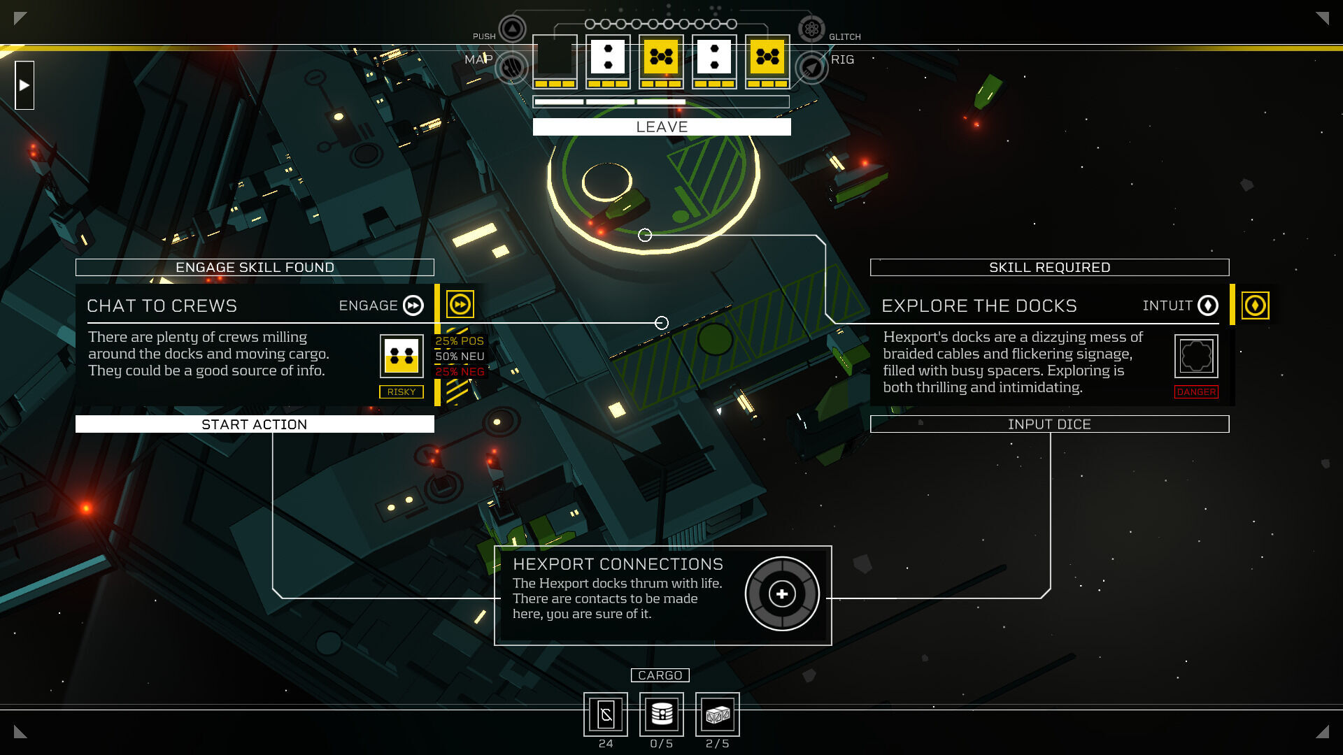 Otro de los aspectos más interesantes ocurre cuando tienes a un mercenario que te sigue la pista. Cada turno estará más cerca de ti, aunque puedes ralentizar su búsqueda mientras viajas entre localizaciones. De hecho, el viaje es un aspecto fundamental en Citizen Sleeper 2, esencialmente para completar misiones y distintos contratos que nos dan cuantiosas recompensas. Puedes llevar a miembros de tu tripulación y que te ayuden así con sus propios dados (sumando oportunidades en cada ciclo), lo cual otorga variedad al planteamiento jugable.