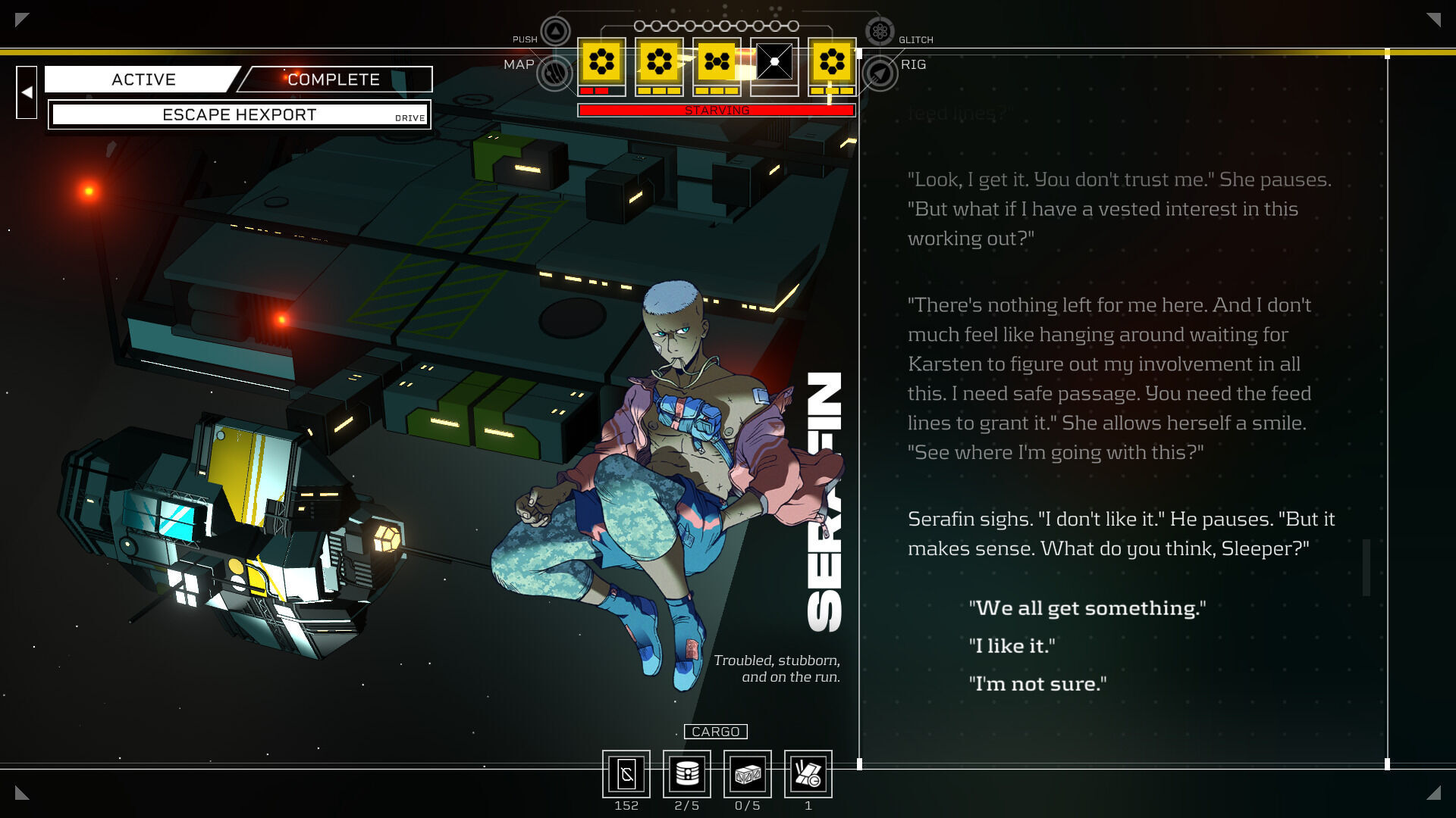 Esto te lo decimos porque una parte fundamental de Citizen Sleeper 2 (como ocurría en el juego original) es empaparte de la historia, meterte en la piel de sus personajes y comprobar cómo se desarrollan los acontecimientos. Es una trama de huida, de mantenerte lejos de los cazarrecompensas que ansían tu cabeza, pero también de encontrar aliados que están -como tú- amenazados por un sistema cruel. Pero has ganado libertad. Tienes tu propia nave para moverte entre distintas localizaciones, así como una tripulación con la que completar una amplia variedad de misiones.