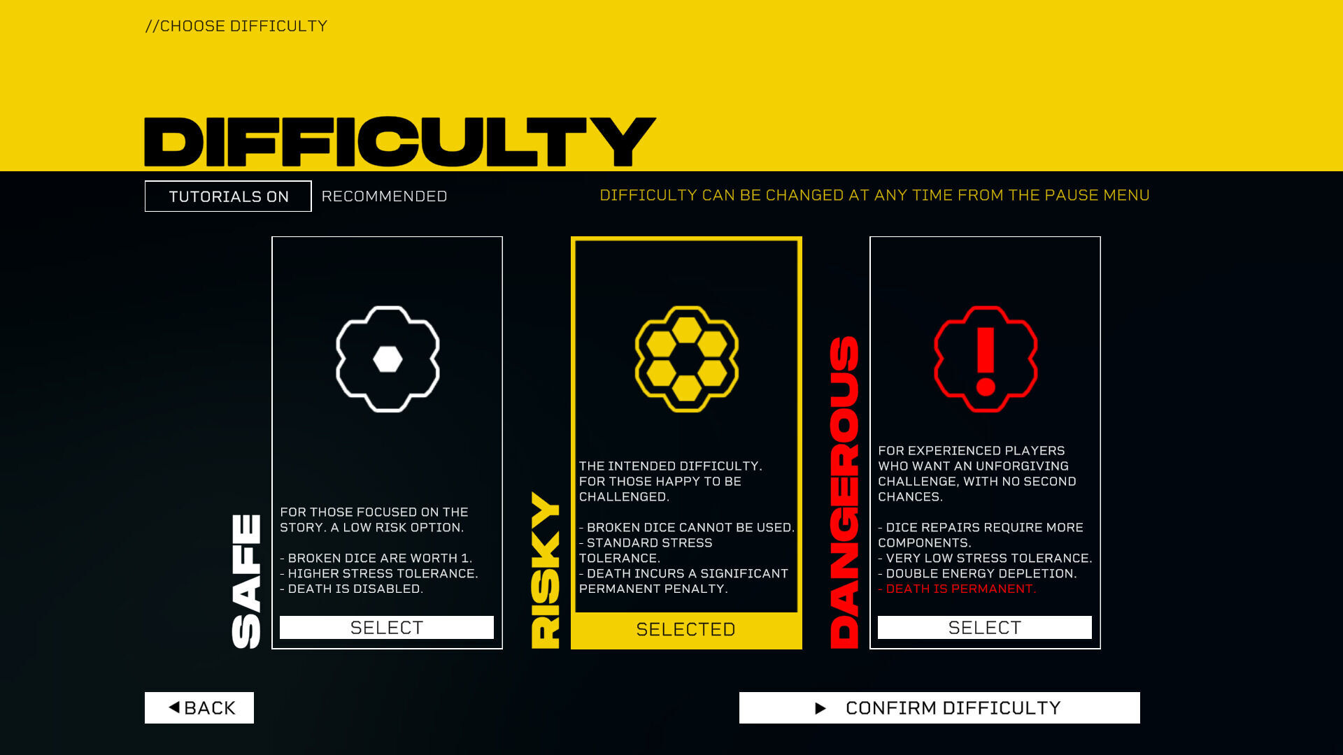 Con bastante buen criterio, se incluye un tutorial con todo tipo de explicaciones (son necesarias), aunque en poco tiempo estarás completamente conectado a su peculiar planteamiento. Puede asustar, parecer enrevesado, pero es más accesible de lo que se pudiera pensar. Al comienzo se te da a escoger entre tres niveles de dificultad: Safe, Risky y Dangerous. Se distinguen en la existencia o no de muerte permanente, así como en la gestión más o menos exigente de los indicadores que antes mencionamos, además de una curiosa y desafiante lógica, que consiste en que se te rompan los dados y tengas que repararlos.