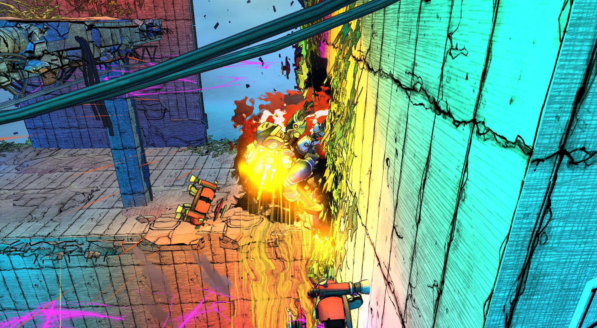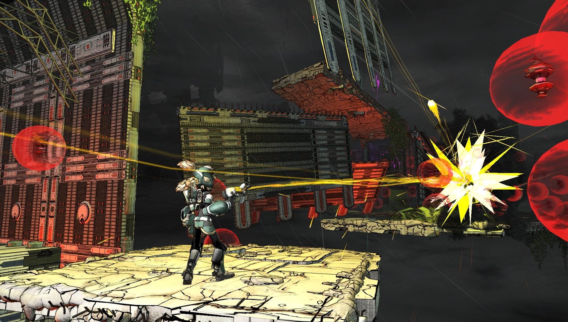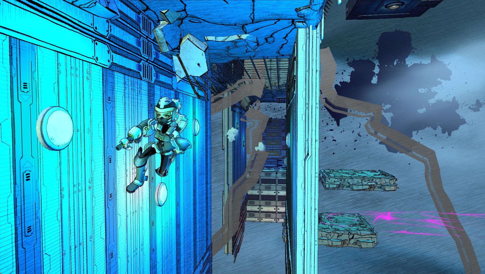 La clave para ello es que contaremos con propulsores que nos permiten saltar más alto, realizar un doble salto, correr a toda velocidad –por el suelo o por las paredes– y cualquier cosa que consigamos combinándolos. Además, tenemos una pistola, con un disparo sencillo que podremos cargar, y que deberemos usar para eliminar los peligros que amenacen nuestro progreso por el escenario. La gracia de todo esto, es, por supuesto, lo más rápido posible, lo que nos invitará a superar una y otra vez cada fase para mejorar nuestro tiempo.