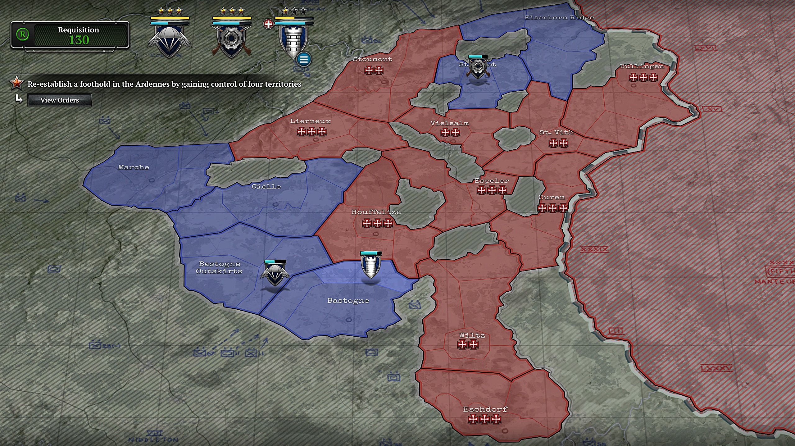 Hay 18 escenarios completamente nuevos, con once misiones y siete enfrentamientos inspirados en los acontecimientos reales de la Batalla de las Ardenas, y tenemos que ir moviendo a las compañías por el metamapa, como si se tratara del juego de tablero Risk, teniendo en cuenta por ejemplo que cuando nos movemos por territorio enemigo para dirigirnos a una batalla, las casillas rojas, perdemos tropas por el camino. Los resultados y la salud general de una compañía se mantienen de una misión a otra, y la veteranía obtenida –una especie de puntos de experiencia- aumenta la eficacia de nuestros soldados, así como las unidades perdidas afectan a su salud general.